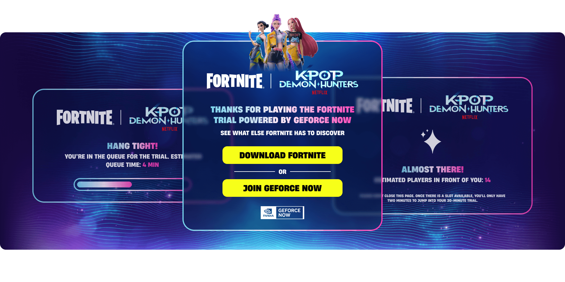 The Fortnite Trial was available across multiple regions and introduced a new way for players to try Fortnite within Discord using Nvidia cloud streaming. PC users who did not have Fortnite installed were able to access two 30-minute sessions per week by linking their Epic Games account and starting a cloud session within Discord. Players could jump into Fortnite with minimal friction and experience the game running at up to 60 frames per second at 1440p resolution through GeForce NOW.